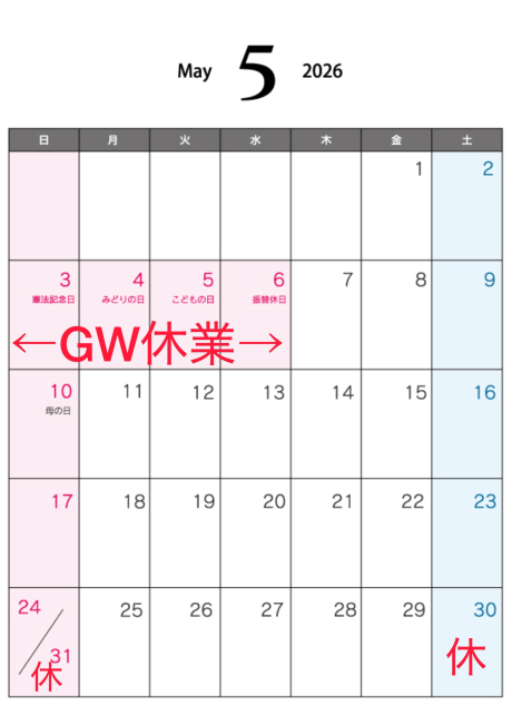 さて、本日は5月の休業日程ご案内です!!